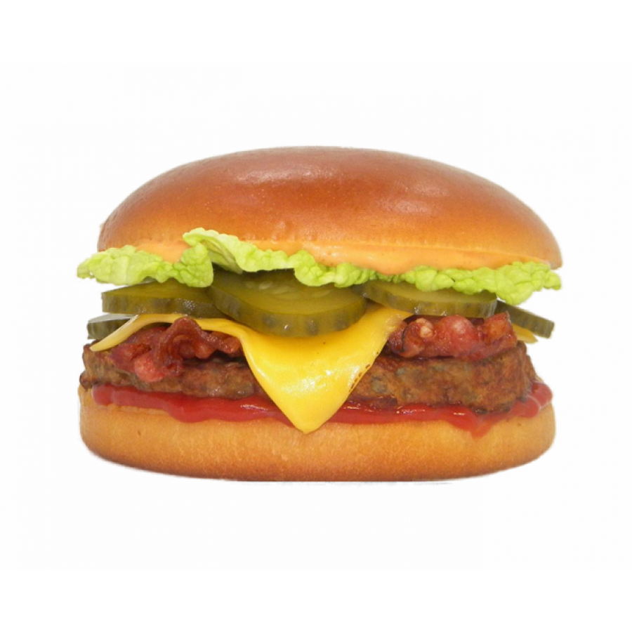 Большой сочный бургер с котлетой из курицы, ломтиками жареного на гриле бекона, свежими листиками салата, маринованным огурчиком, луком криспи и плавленым сыром, в сочетании с соусом бургер-барбекю.
