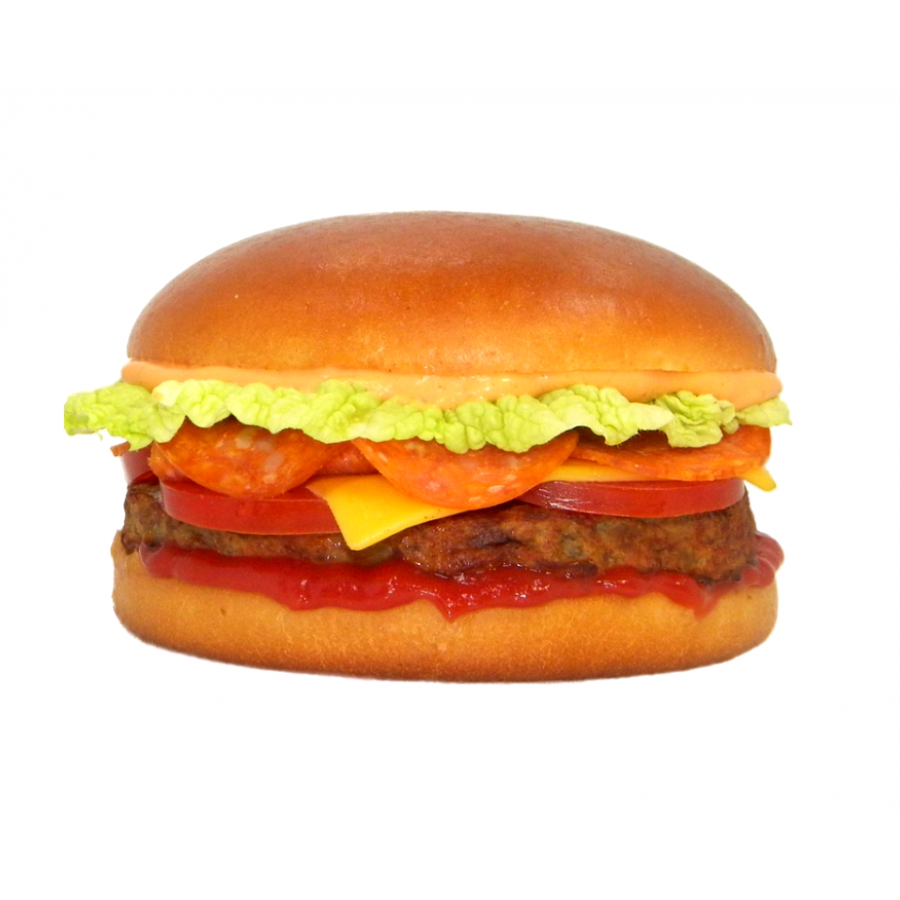 Большой сочный бургер с котлетой из курицы, колбасками пепперони, томатом, свежими листиками салата, луком криспи и плавленым сыром, в сочетании с острым соусом кимчи-бургер.