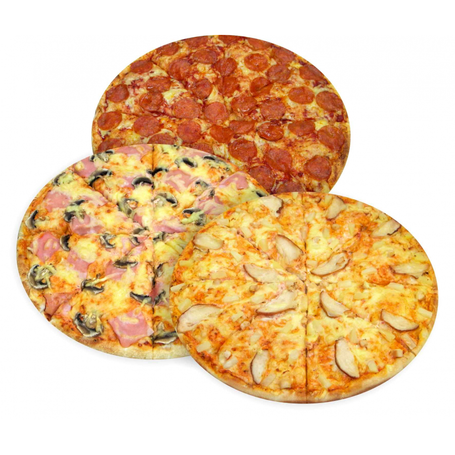 Пицца "Пепперони" 40см, Пицца "Ветчина и грибы" 40см, пицца "Гавайская" 40см.