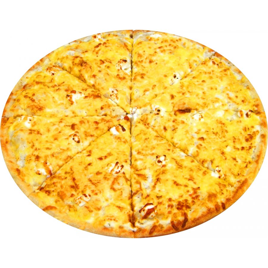 Пышная пицца на толстом тесте. Сыр гауда, сыр пармезан, сыр моцарелла, сыр креметте, фирменный сливочный пицца-соус.