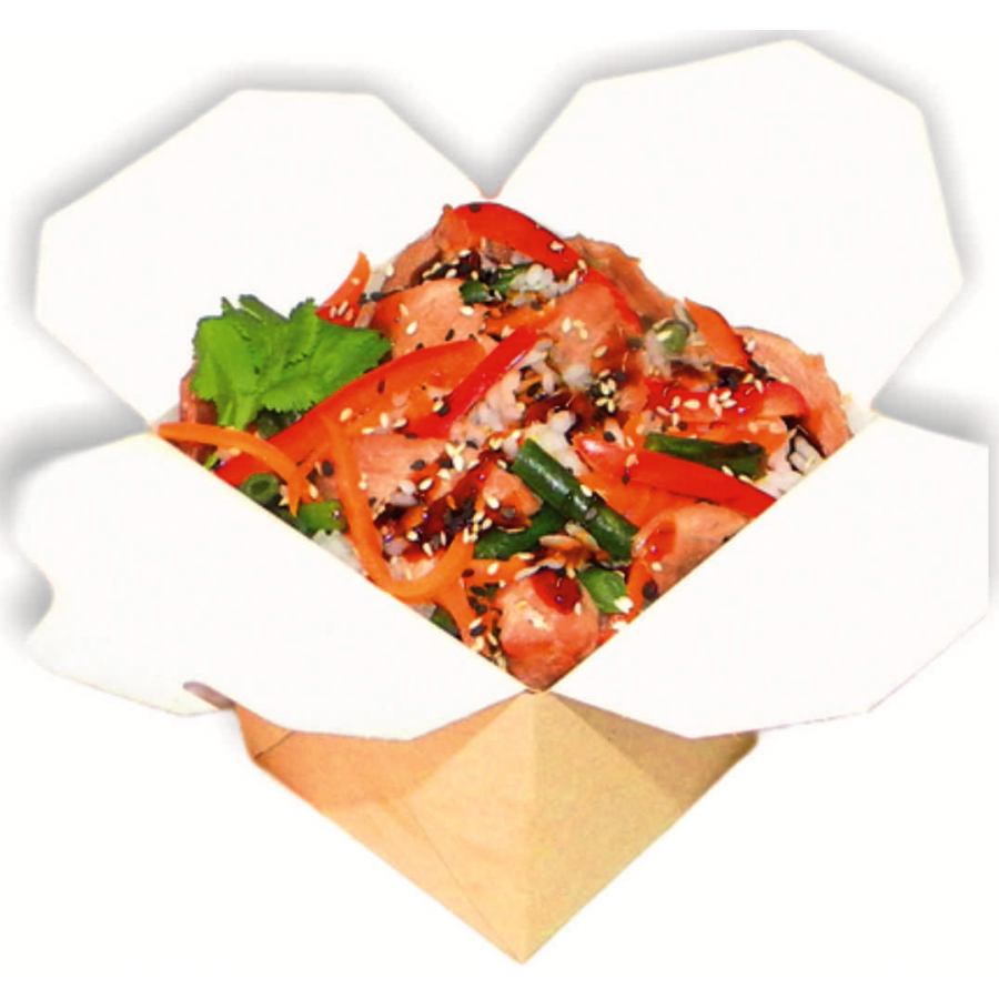 Рис, вырезка свиная, болгарский перец, фасоль стручковая, морковь, красный репчатый лук, соус терияки, кунжут, кинза.
